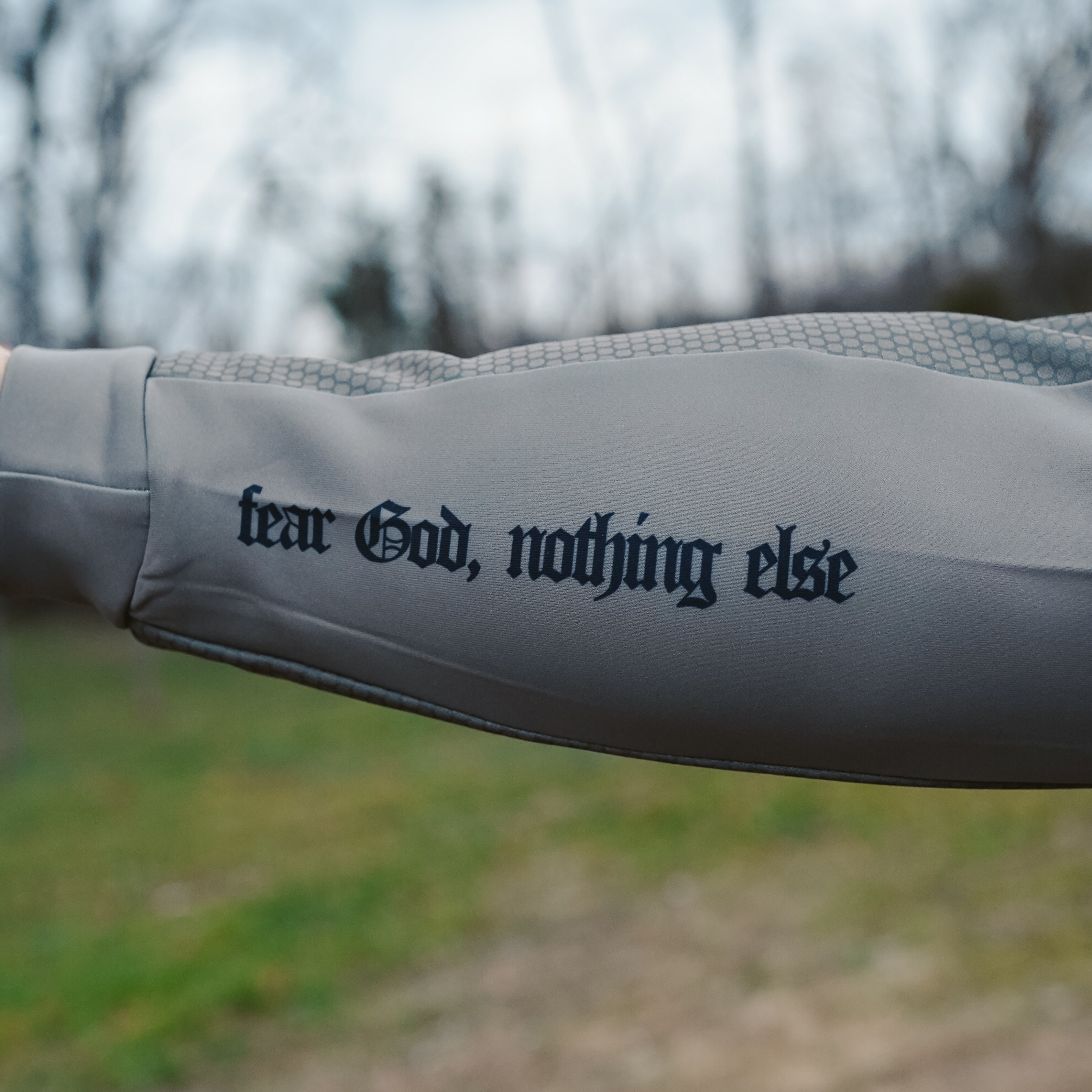 “fear God, nothing else” on the inside of the right arm and our logo on the back located under the collar.